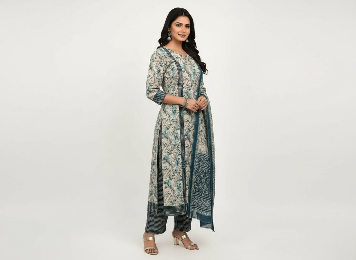 3‑piece set: straight kurti, matching bottom wear, and coordinated dupatta.
