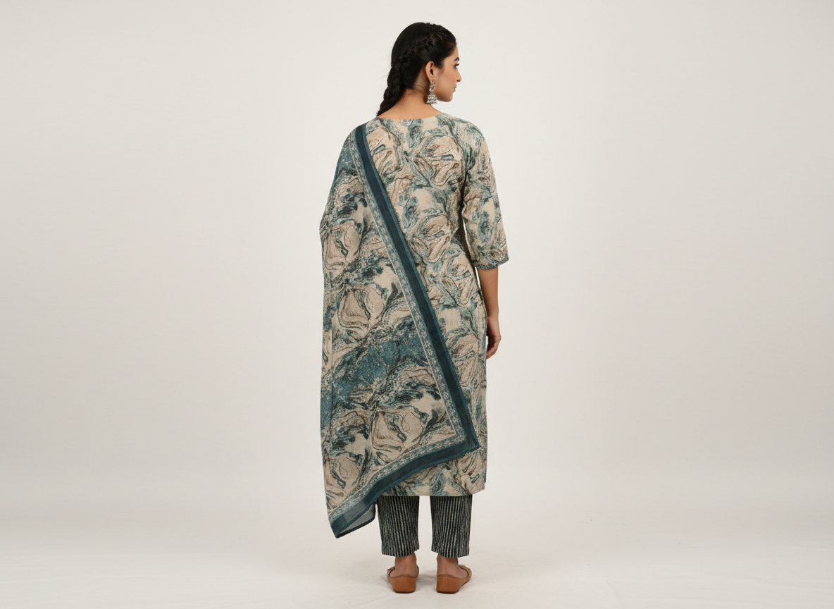 Elevate your everyday ethnic style with this elegant blue marble‑print kurti set, complete with matching pant and dupatta. Designed for all‑day comfort and a polished look, it is perfect for office, casual outings, and small functions.