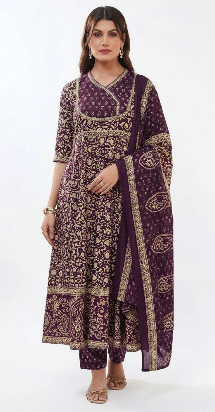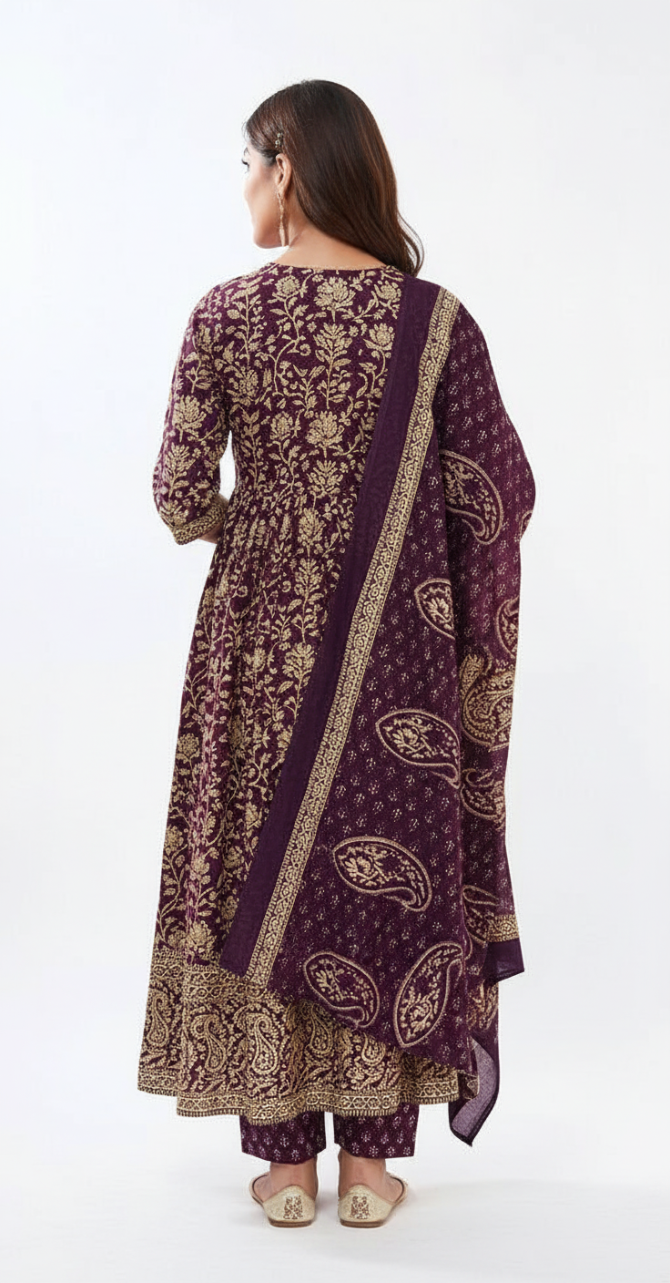 This premium maroon kurta set features intricate gold print all over the kurta, pant and dupatta, giving a rich festive look perfect for parties, poojas and family functions.